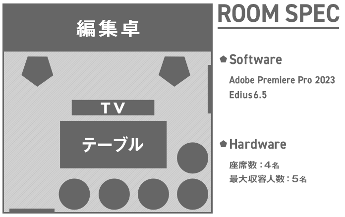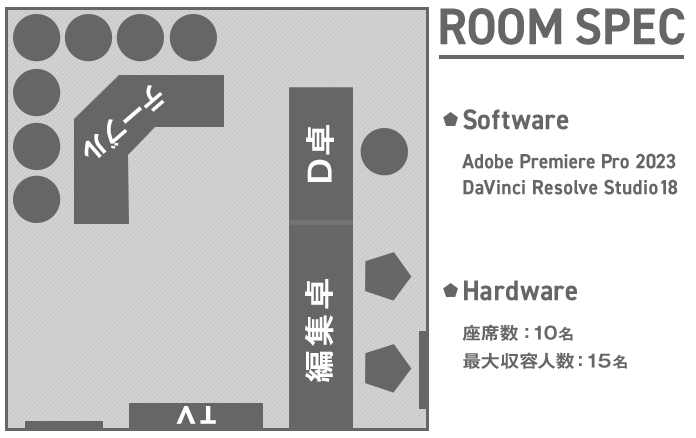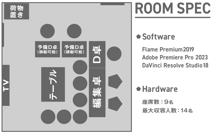 Premiereをメインとしたノンリニア編集で 主にTV番組を担う編集室です。 Ediusなどの多種のノンリニア編集機・リニア編集システムも 残っており、幅広いご要望に対応できます。 XDCAMへのプリント作業がベースバンドで行うことができます。