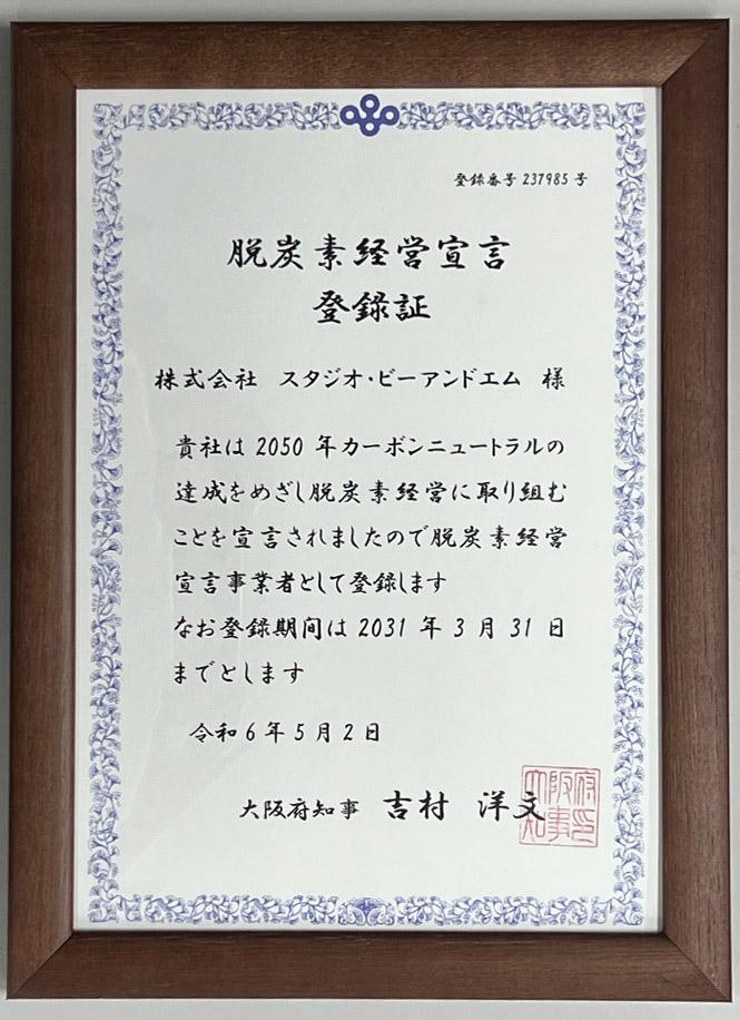 さまざまな目標に取り組んでまいりました。そしてこの度大阪府が掲げる「脱炭素経営宣言事業者」