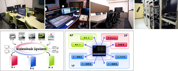 1階編集室(R-1.2.3)は、編集機と編集室の組み合わせが自由に選べるビデオハブシステムを導入。また、4K編集にも対応しております。