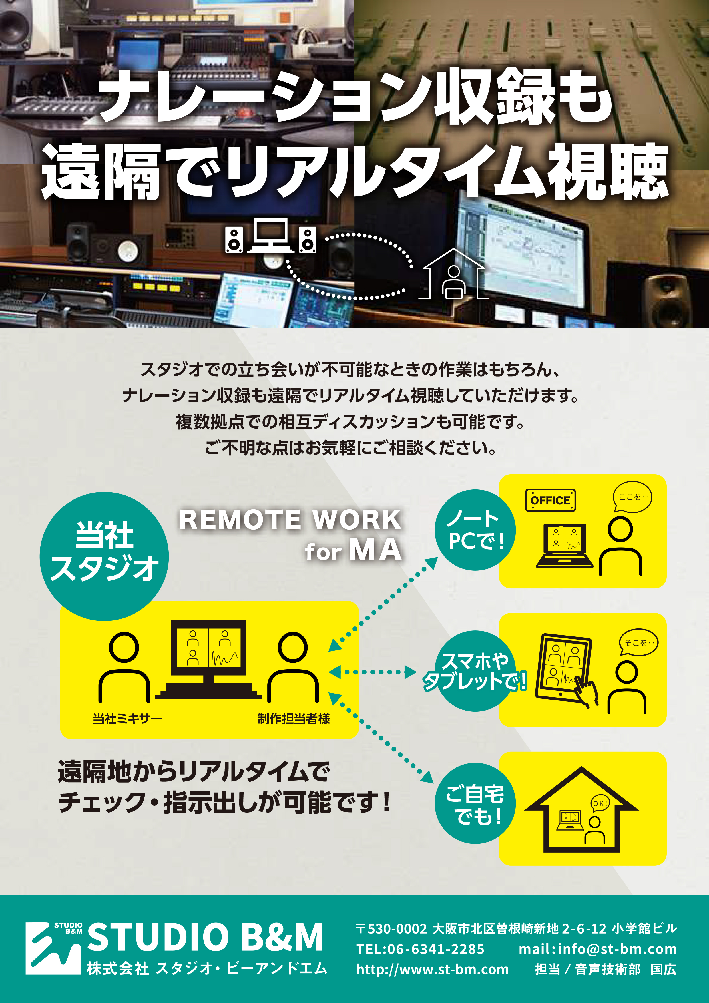 この度、MAでも密閉・密集・密接を避ける為、画面共有ソフトや会議ソフトを使用した作業音声のリアルタイム視聴サービスを開始しております。 ナレーション収録時の音声もリアルタイムで視聴でき、ビデオチャット併用による双方向の会話もスムーズに行えます。