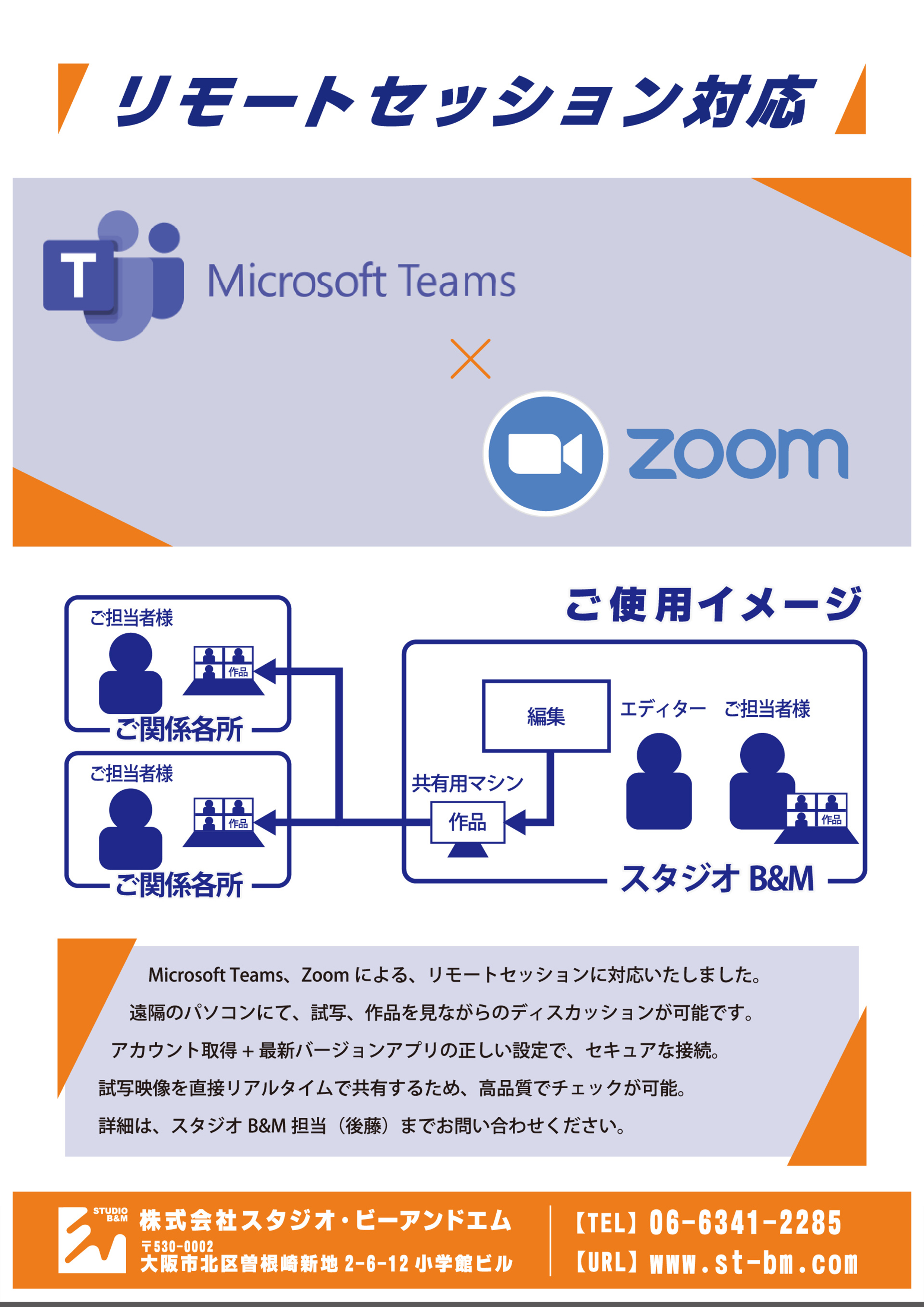 またお立ち会い人数を減らし、在宅・テレワークでの編集に対応すべく「Microsoft Teams」、「Zoom」でのリモートセッションが可能になりました。